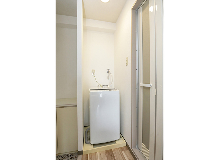 冷蔵庫、電子レンジ、洗濯機、照明器具が付いています。